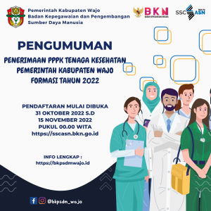 Setelah penantian panjang, akhirnya pendaftaran PPPK Tenaga Kesehatan dibuka pada 31 Oktober 2022 S.D 15 November 2022. Pemerintah Kabupaten Wajo diberikan kuota PPPK Tenaga Kesehatan sebanyak 52 Formasi.